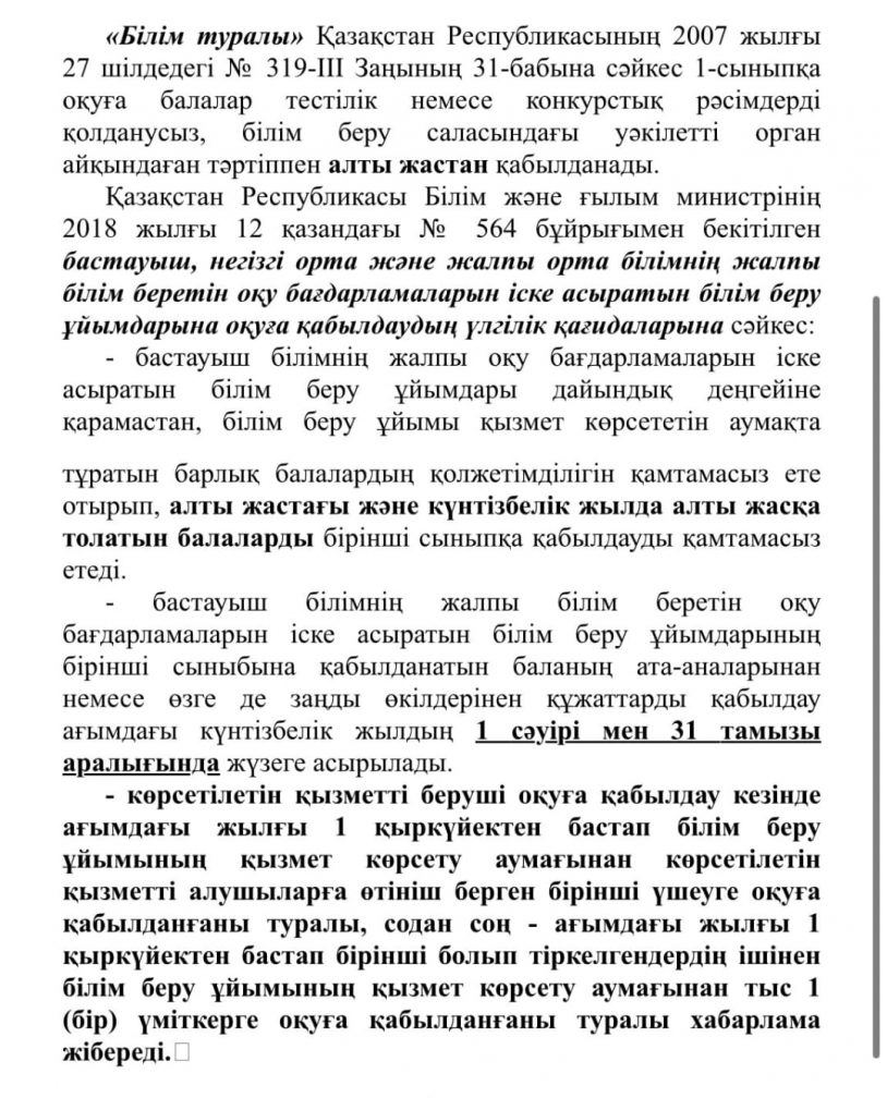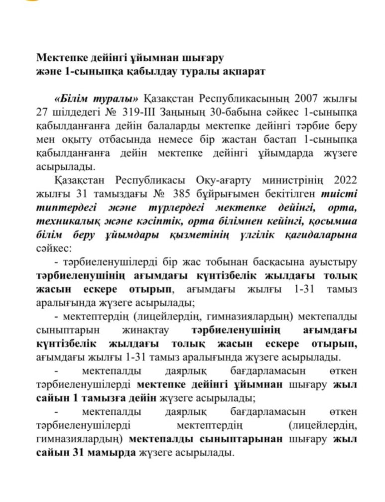Мектепке дейінгі ұйымнан шығару және 1- сыныпқа қабылдау туралы ақпарат
